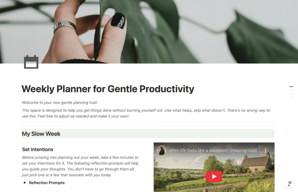 A minimalist Notion planner for gentle productivity — designed to help you plan your week based on your energy levels, without pressure to perform.